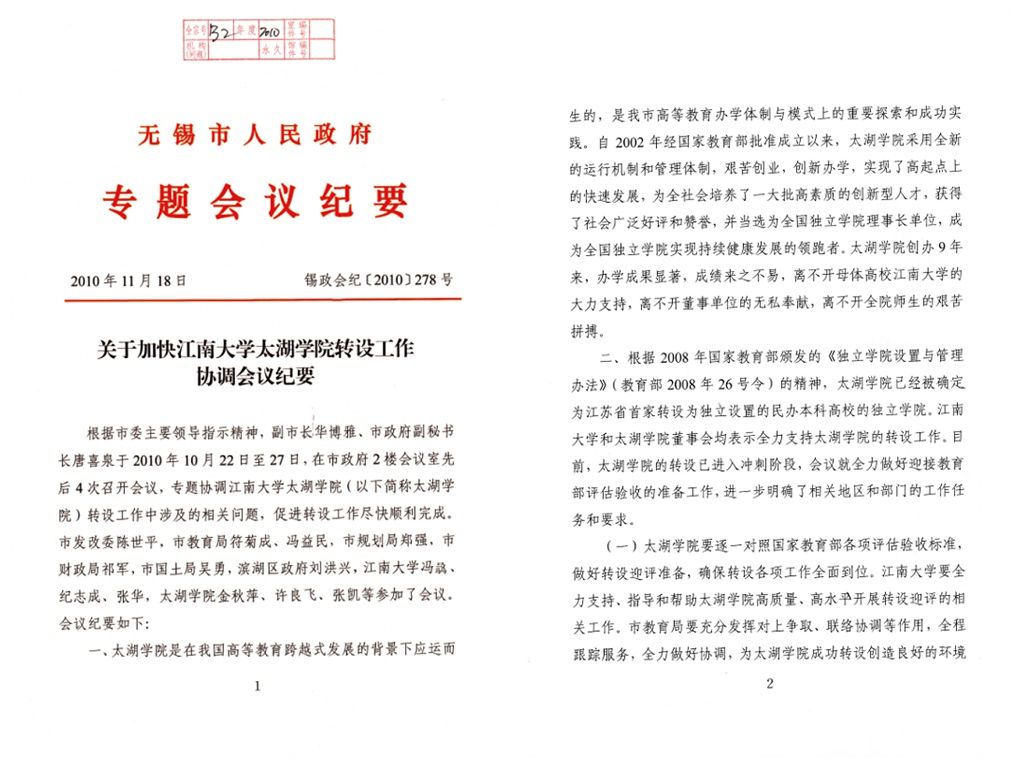 无锡市委召开会议推进江南大学太湖学院转设工作