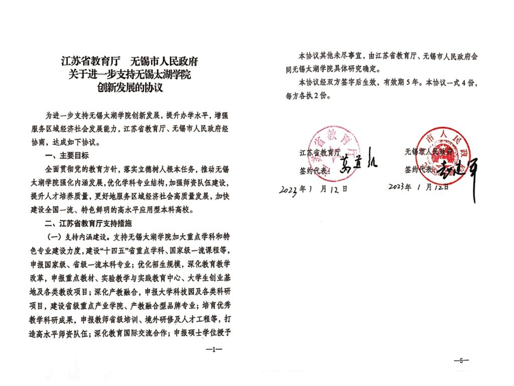 江苏省教育厅、无锡市人民政府共同签署《关于加大支持无锡太湖学院创新发展的协议》