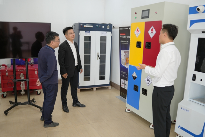 在无锡华纳威尔金属制造有限公司,阙明坤一行在公司董事长、我校2003级计算机科学与技术专业校友杨东华的陪同下,参观了企业办公环境、生产车间,详细了解了企业的发展历程、核心技术及战略规划。作为中国国内知名的危化品安全管控领域的标杆服务商,无锡华纳威尔金属制造有限公司依托20余项专利技术、国家高新技术企业资质,以及参与《实验室废弃物存储装置技术规范》等国标制定的权威背景,为政企客户提供从安全存储装备、应急管理系统到环保处置服务的全方位保障,其室外危化品暂存柜等产品获政府应急管理系统推荐。