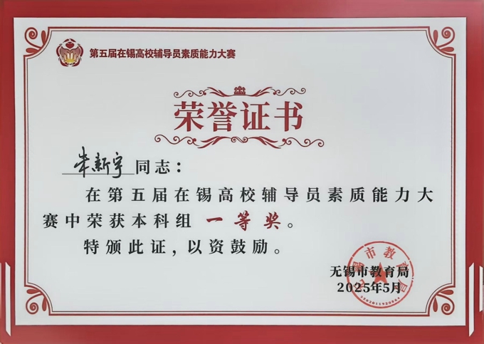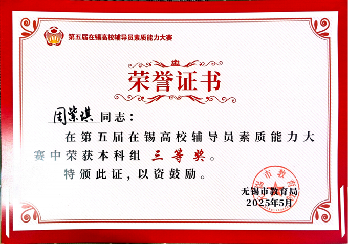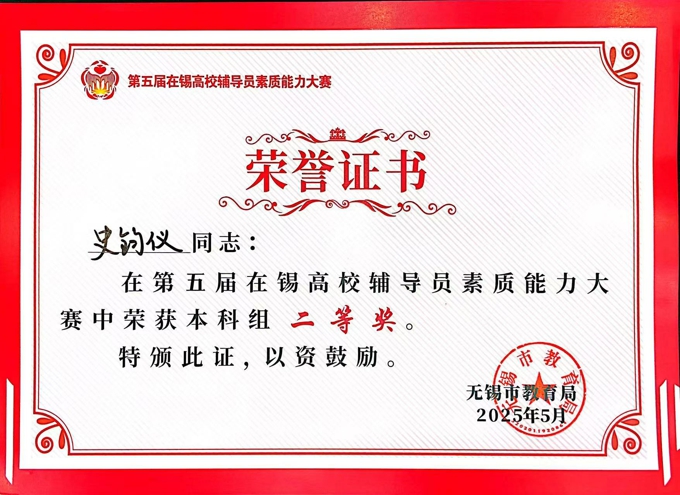 5月21日至22日,由无锡市教育局主办的第五届在锡高校辅导员素质能力大赛成功举办。学校在本次大赛中表现卓越,荣膺本科组优秀组织奖;朱新宇、史钧仪、周紫琪等3名辅导员分获本科组一、二、三等奖,充分展现了我校辅导员队伍的专业素养。