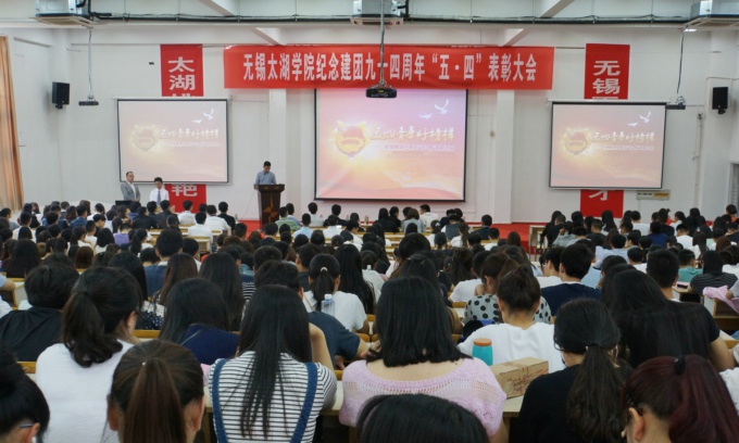 无锡太湖学院纪念建团九十四周年“五·四”表彰大会在庄严的国歌声中拉开帷幕,校党委副书记丁涛为表彰大会致辞。他肯定了2015年共青团组织对学校青年人才培养和各项事务组织所作出的积极贡献,对各级团组织提出四点希望:一、广大青年团员要利用先进思想武装自己,发挥生力军和模范带头作用。二、各级团组织和团干部要充分发挥职能作用,真正成为党联系青年群众的桥梁和纽带。三、继承“五四”精神传统,刻苦学习,增长才干,做当代青年的先锋。四、勇于创新,努力做社会主义事业的开创者和建设者。