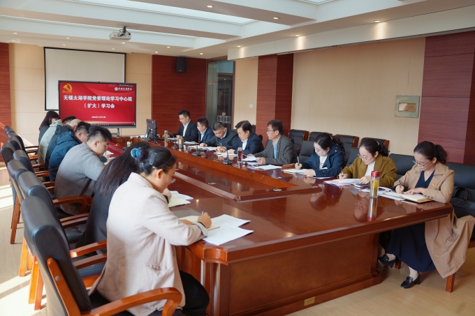 11月14日,无锡太湖学院召开党委理论学习中心组(扩大)学习会,专题学习党的二十届四中全会精神。党委书记孙玉坤,党委委员、校领导吴健荣、丁涛、阙明坤、郑斌,党委委员凌晨、邹山花、吴学林出席学习会。党委相关职能部门及各二级学院党总支有关负责人列席。