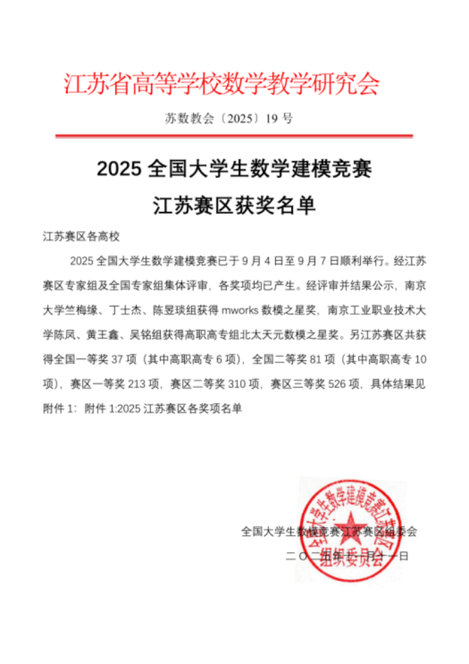 近日,2025全国大学生数学建模竞赛江苏赛区获奖名单正式公布。我校首次参加该赛事,共有10支队伍参赛,在强手如云的本科建模赛道脱颖而出,凭借扎实的学科功底与出色的实践能力斩获省级一等奖 1 项、省级三等奖 3 项,参赛队伍获奖比例达40%,在这项权威赛事中实现开门红,位居江苏省同类高校前列。