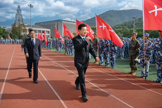 无锡太湖学院校长金成在讲话中向全体新生表示热烈欢迎,并向承训部队官兵和参与组织工作的师生致以诚挚感谢。他指出,军训是大学生涯的第一课,是开展国防教育、磨砺意志品格的重要实践。金成介绍了学校办学23年来在学科建设、人才培养、社会服务等方面取得的显著成就,勉励2025级新生以“太湖人”的身份,积极践行“自强不息、经世致用”的校训精神。立足新征程,金成对全体新生提出三点希望:一要勇担使命、胸怀家国,树立为中华民族伟大复兴而读书的远大志向,在专业学习中夯实根基,在实践创新中增长才干;二要勤学笃行、开拓创新,以坚韧不拔的毅力攻坚克难,以实事求是的态度追求真理,在不断突破自我中实现创新能力的跃升;三要实干奋进、成就未来,践行校训精神,在“知行合一”中锤炼真本领,努力成为有理想、敢担当、能吃苦、勇奋斗的新时代优秀大学生。他强调,同学们生逢盛世,当不负盛世,要珍惜在大学校园的宝贵时光,努力成长为堪当民族复兴大任的时代新人。