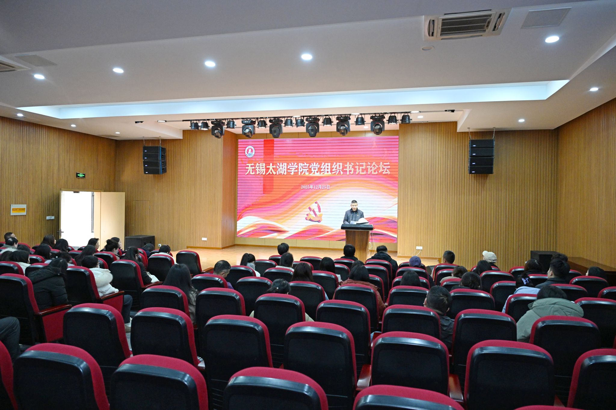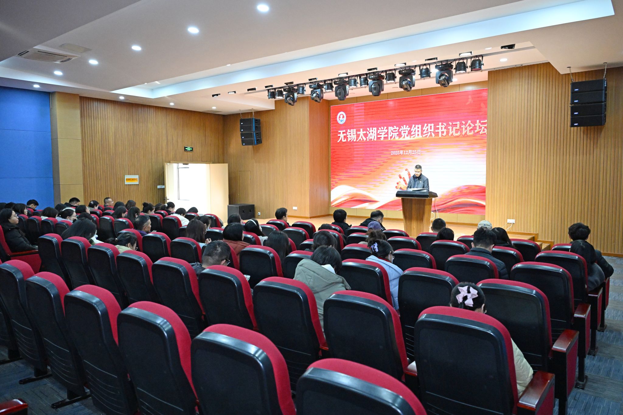 为筑牢高校党建工作根基,切实把党组织优势转化为育人动能,12月25日,无锡太湖学院党组织书记论坛在大学生活动中心A顺利举办。学校党委书记孙玉坤、党委副书记丁涛出席,党委委员、党委办公室主任凌晨主持活动,江南大学马克思主义学院教授唐忠宝应邀莅临现场作专题授课。