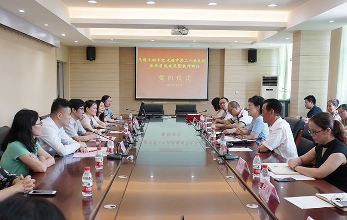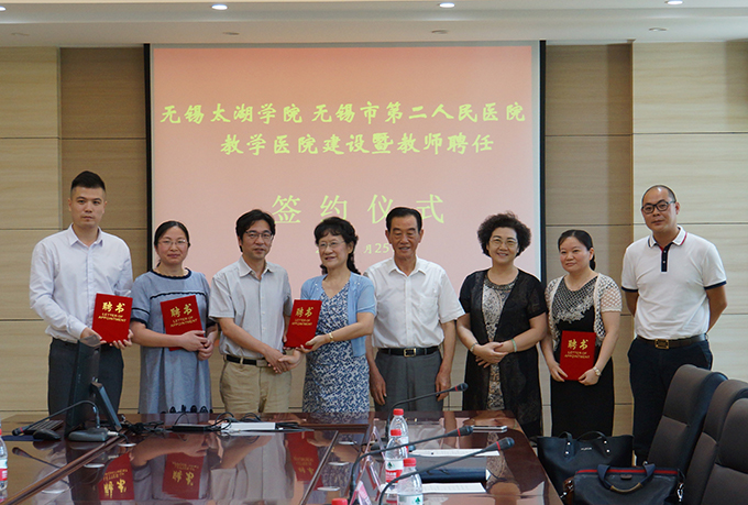 7月25日,无锡太湖学院与无锡市第二人民医院签约共建教学医院。校党委书记金秋萍、副校长王心如、陈鹏飞等领导参加签约仪式,王心如教授及市二院肖大江副院长分别代表两单位签约,校领导为市二院聘任教师发放聘书。