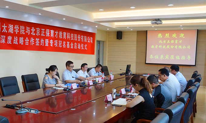 本网讯 7月25日下午,无锡太湖学院与北京正保育才教育科技股份有限公司深度战略合作签约暨专项冠名基金启动仪式在我校六号楼二楼会议室举行。正保育才总经理彭乐群、教学教务总监颜红宝,我校副校长何宏金、陈鹏飞等出席签约和启动仪式。