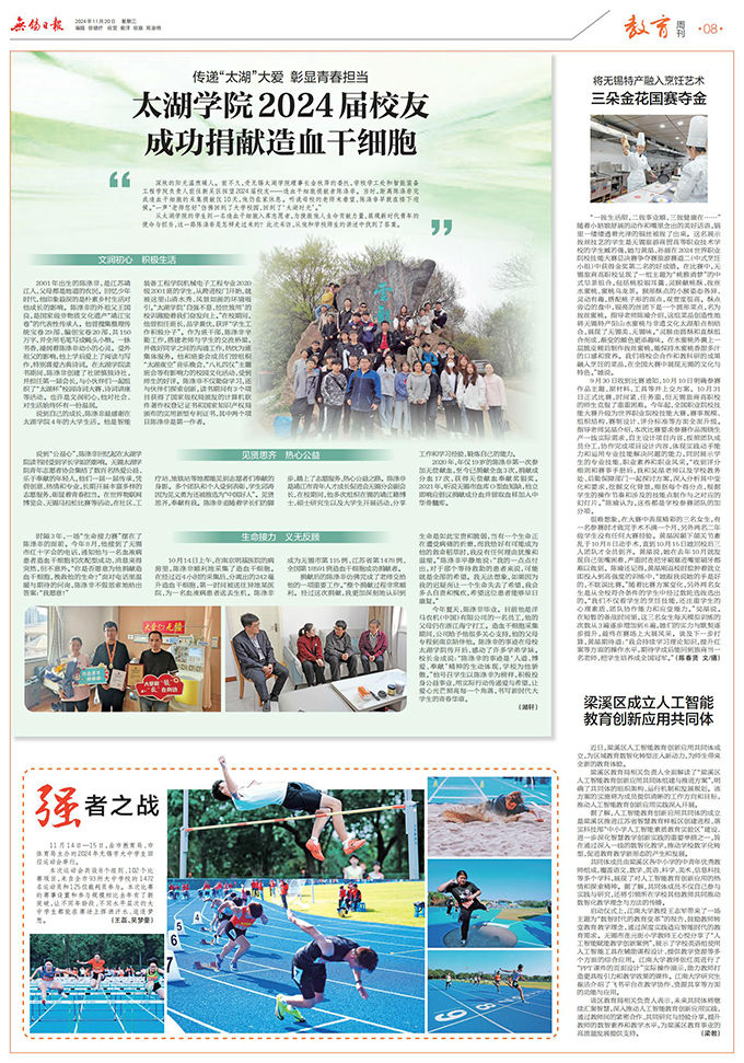深秋的阳光温煦暖人。前不久,受无锡太湖学院理事长金秋萍的委托,学校学工处和智能装备工程学院负责人前往新吴区探望2024届校友——造血干细胞捐献者陈涤非。当时,距离陈涤非完成造血干细胞的采集捐献仅10天,他仍在家休息。听说母校的老师来看望,陈涤非早就在楼下迎候。“一声‘老师您好’仿佛回到了大学校园,回到了‘太湖时光’。”