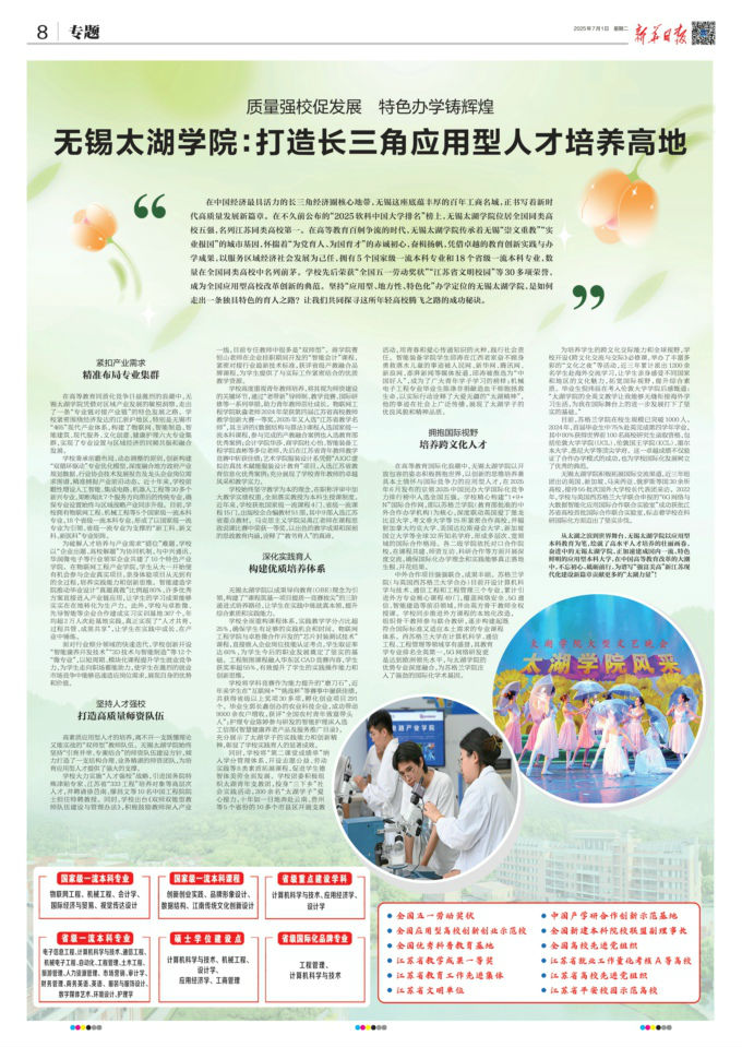 在中国经济最具活力的长三角经济圈核心地带,无锡这座底蕴丰厚的百年工商名城,正书写着新时代高质量发展新篇章。在不久前公布的“2025软科中国大学排名”榜上,无锡太湖学院位居全国同类高校五强,名列江苏同类高校第一。在高等教育百舸争流的时代,无锡太湖学院传承着无锡“崇文重教”“实业报国”的城市基因,怀揣着“为党育人、为国育才”的赤诚初心,奋楫扬帆,凭借卓越的教育创新实践与办学成果,以服务区域经济社会发展为己任,拥有5个国家级一流本科专业和18个省级一流本科专业,数量在全国同类高校中名列前茅。学校先后荣获“全国五一劳动奖状”“江苏省文明校园”等30多项荣誉,成为全国应用型高校改革创新的典范。坚持“应用型、地方性、特色化”办学定位的无锡太湖学院,是如何走出一条独具特色的育人之路?让我们共同探寻这所年轻高校腾飞之路的成功秘诀。