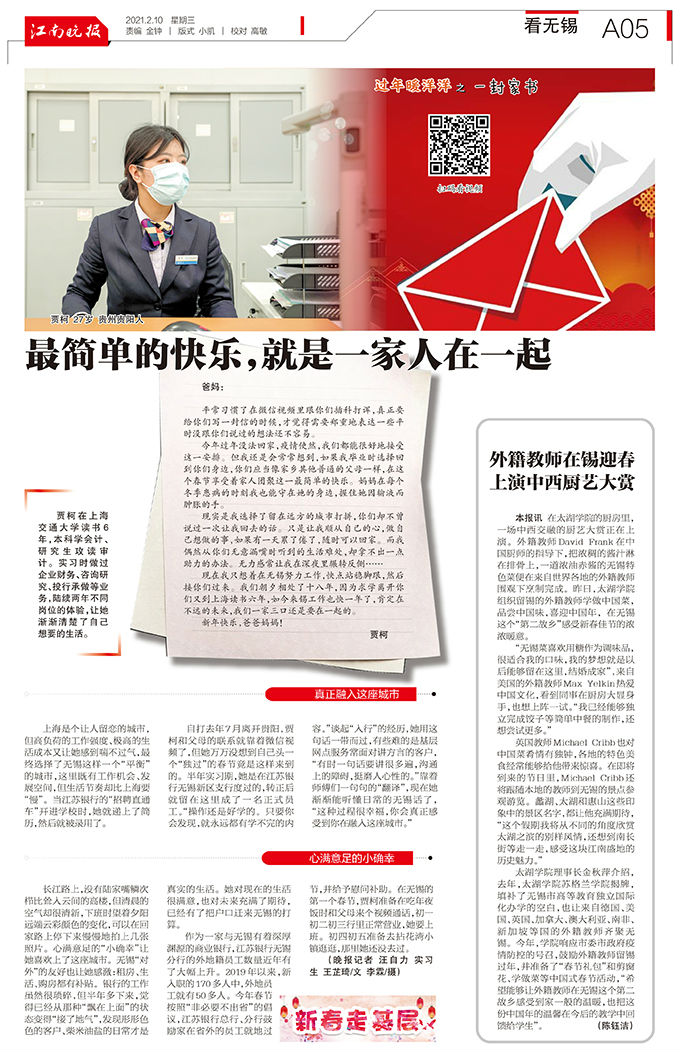 “无锡菜喜欢用糖作为调味品,很适合我的口味,我的梦想就是以后能够留在这里,结婚成家”,来自美国的外籍教师Max Yelkin热爱中国文化,看到同事在厨房大显身手,也想上阵一试。“我已经能够独立完成饺子等简单中餐的制作,还想尝试更多。”