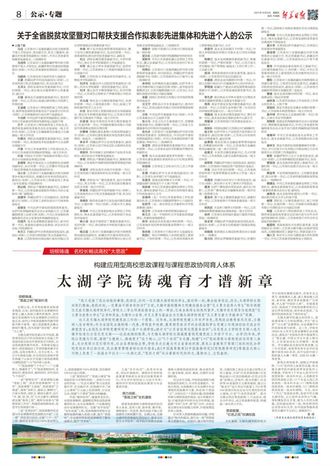 这只是无锡太湖学院党建思政工作的一个剪影。近年来,太湖学院党建工作有声有色,思想政治教育春风化雨,立德树人佳音频传:作为全国民办高校唯一代表,学校在中组部、教育部党组召开的全国高校学生党建工作现场经验交流会作典型发言;全国民办学校党建研究中心落户太湖学院;被评为“江苏省优秀志愿服务组织”;马克思主义学院党支部入选无锡市标准化示范化党支部……这些成绩的取得,与无锡太湖学院长期高度重视党建思政工作密不可分。办学20年来,学校以党建为引领,围绕“立德树人、铸魂育才”这个核心,以“5个协同”为支撑,构建“1+5”思政课程与课程思政协同育人体系,充分发挥示范引领作用,社会各界纷纷点赞,学校多次应邀为河北省委组织部、黑龙江省教育厅等部门组织的民办学校党组织书记培训班、民办教育管理者培训班作报告;在《中国高等教育》《中国高教研究》《思想教育研究》等高层次核心刊物上发表了一批高水平论文……太湖之滨,“思政之树”沐浴着新时代的阳光,蓬勃向上、生机盎然。