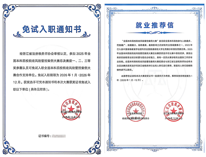 本次国赛获奖队伍的指导老师为会计学院的姚瑶、刘晓敏、仲伟俊,参赛学生分别是周梦茹、熊钰莹、季叶凡。自备战以来,在指导教师的全程悉心指导下,这支团队历经校内选拔、省级复赛的层层淬炼,深入钻研企业真实涉税案例,反复打磨风险管控方案,精准拆解复杂涉税难题。在案例汇报、专家提问和现场答辩等多个环节的激烈角逐中,三位队员沉着冷静、配合默契,充分展现了扎实的财会专业知识、敏锐的风险洞察能力、清晰的逻辑思维以及卓越的团队协作精神,其精彩表现赢得了评委们的一致认可与好评。赛后,队员们收到了浙江省注册税务师协会颁发的免试入职通知书及就业推荐信。