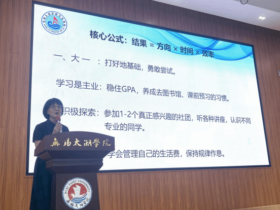 接着,刘院长围绕大学学习的核心方法与成长路径,与新生们分享了宝贵建议。她强调了“结果=方向×时间×效率”这一核心公式,并寄语新生在大一阶段要“打好基础,勇敢尝试”。刘院长鼓励同学们积极探索,参加感兴趣的社团,广泛听取讲座,结识不同专业的伙伴,保持规律作息,全面提升综合素质。