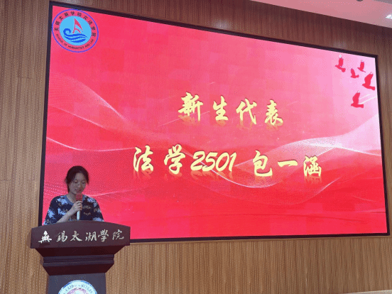 最后,来自法学2501班的新生代表包一涵同学发言,表达了成为一名“文法人”的激动与自豪。她代表全体新生承诺,将牢记师长的教诲,恪守校规校纪,勤奋学习,积极实践,不负时代,不负韶华,为学院和学校的发展贡献青春力量。