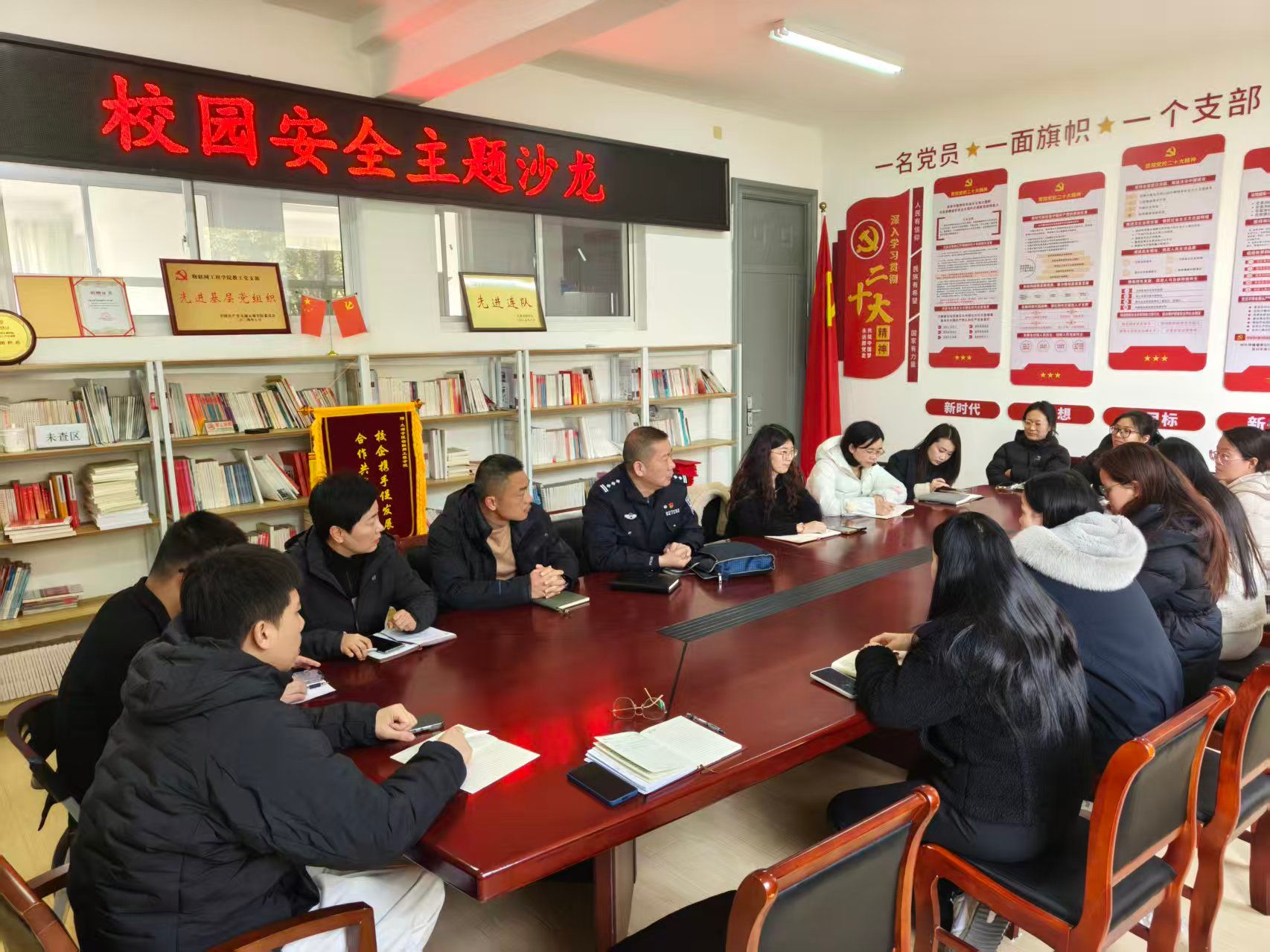 为统筹推进学院学生工作提质增效,筑牢校园安全防线,精准部署就业服务与日常管理重点任务,近日,物联网工程学院学工队伍召开专题学工例会。学院党总支副书记沈峰主讲并作全面工作部署,荣巷派出所驻校民警周警官受邀参会,为学院全体辅导员开展反诈宣传与安全答疑。全体学工人员、辅导员参加会议。