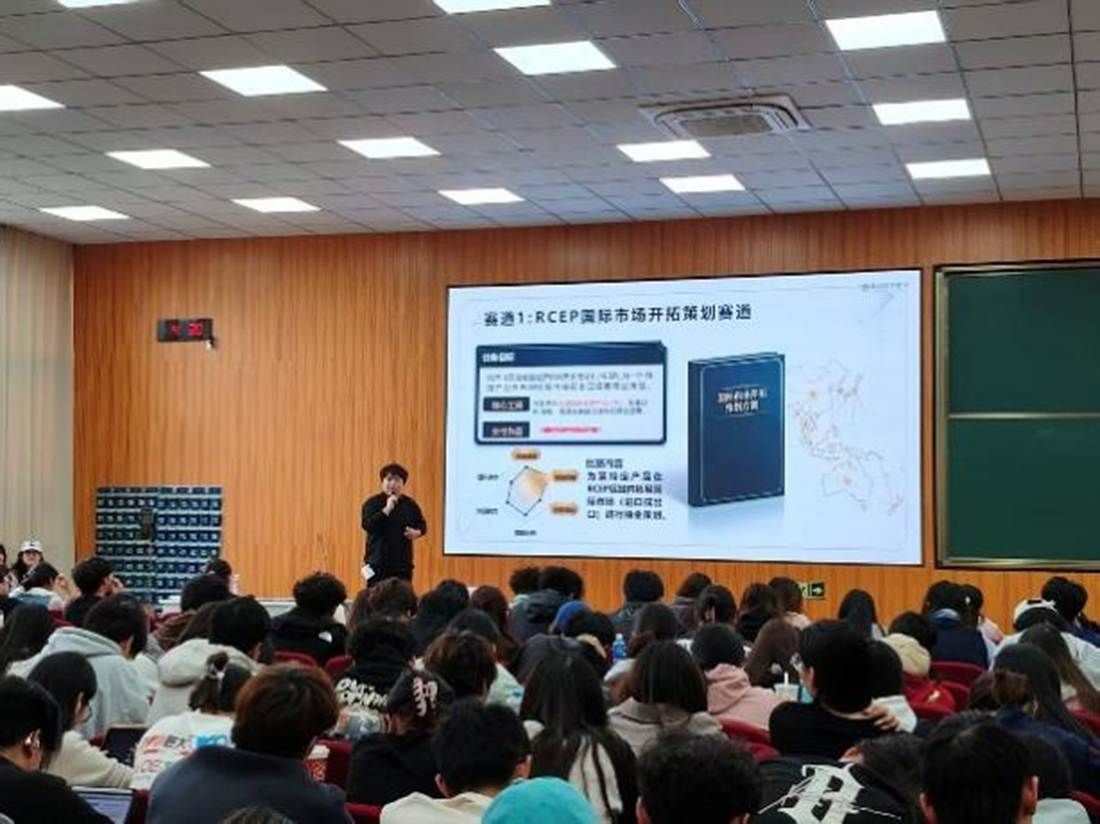 商学院国际经济与贸易系李智洲老师对全国商业精英挑战赛国际贸易竞赛,进行专题介绍。他系统梳理赛事五大赛道,分别讲解RCEP策划、贸易与商务、涉外法律、贸易标准、跨境电商赛道的核心任务、作品要求及适配专业人群。同时,李老师公布了比赛的时间安排,明确参赛资格、队伍编制等重要信息,并分享赛事咨询群号,为同学们答疑解惑、搭建交流平台。