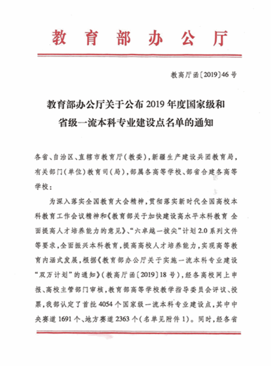 2019年,学校三个专业入选教育部首批一流本科专业名单