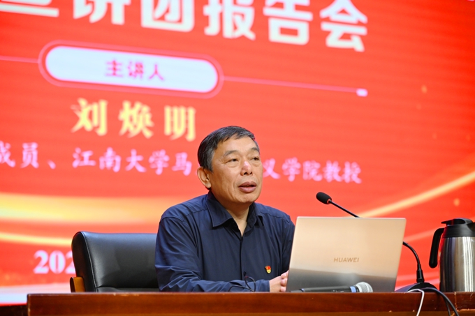 根据市委统一部署,11月26日下午,学习贯彻党的二十届四中全会精神市委宣讲团宣讲报告会在无锡太湖学院工科大楼报告厅举行。市委宣讲团成员、江南大学马克思主义学院刘焕明教授作宣讲报告。学校党委书记孙玉坤,校领导丁涛、阙明坤、毛照红,党委委员凌晨、吴学林出席。学校各级党组织负责人、师生代表共700多人参加会议。副校长、党委委员阙明坤主持报告会。
