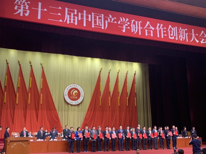 本网讯 2019年12月30日,第十三届中国产学研合作创新大会在北京召开,来自科技部、工信部、教育部、中科院等国家相关部委、科研院所的领导、专家、学者以及来自全国产学研界第一线的1200余名代表出席大会,十三届全国政协副主席、中国科协主席万钢,全国人大常委会原副委员长陈至立,十二届全国政协副主席王钦敏等领导嘉宾出席大会并发表演讲。会议表彰了2019年在产学研合作、成果转化、军民融合、工匠精神等方面作出贡献的先进单位和个人。我校荣获2019年中国产学研合作创新奖,副校长金成出席大会并代表学校领奖。