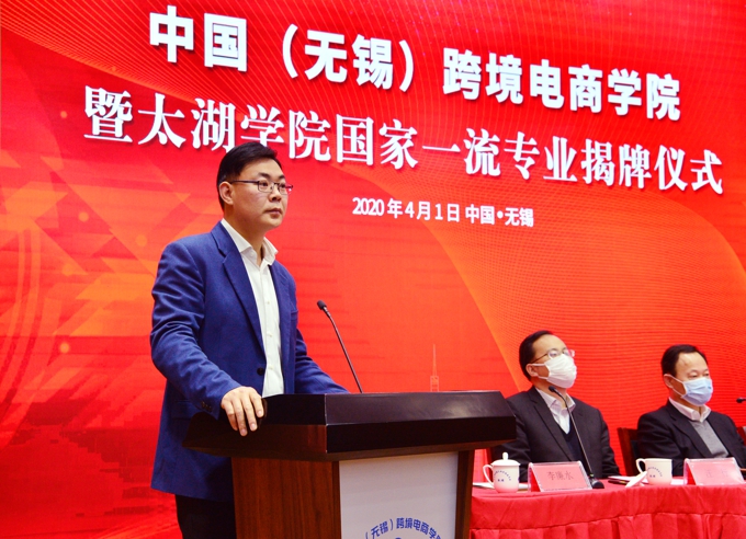本网讯 4月1日,中国(无锡)跨境电商学院在无锡太湖学院揭牌成立。市政协主席周敏炜为跨境电商学院、3个国家一流专业和“区块链技术研发和应用中心”揭牌。市教育局局长唐加俊、市商务局局长汪行、市商务局跨境电商处处长欧国君、滨湖区商务局副局长印德强等出席本次活动。中国服务贸易协会副会长、秘书长仲泽宇,中国电子商务跨境电商工作委员会秘书长吴申星,无锡跨境网商商会会长许大可、秘书长葛加平,江苏省跨境网商商会联盟创始人刘学绪,无锡跨境电商中小企业商会会长宋花江等行业协会代表,以及中国邮政集团有限公司无锡市分公司副总经理黄定清、eBay大中华区商务总监刘德强、无锡光柏网络科技有限公司总经理汤叶灿、无锡光柏网络科技有限公司联合总经理朱振伟、阿里巴巴通锡区总经理张志飞、无锡优级先科信息技术有限公司总经理孙钰、无锡壹佳环球科技有限公司总经理胡诸鸿等企业代表参加。学校理事长、党委书记金秋萍,副校长陈鹏飞,学校中层以上干部、商学院部分教师代表参加。会议由副校长陈鹏飞主持。