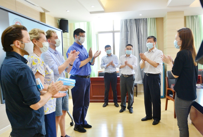 外教们为太湖学院的国际化教育和学生们的英语培养做了很大的贡献,在疫情期间更是能够严格按照疫情防范的各项要求,积极回报社会,如参加献血活动,得到广泛关注和赞誉。会上,外教们畅述了防疫经历、线上教学的感受和想法,纷纷表示感觉到了在太湖学院这个大家庭的温暖,也表达了希望可以在学校一直工作下去的意愿。最后,李校长高度赞赏了外教认真教学的工作态度和工作成效,并代表学校向四位外籍教师赠送了防疫口罩。