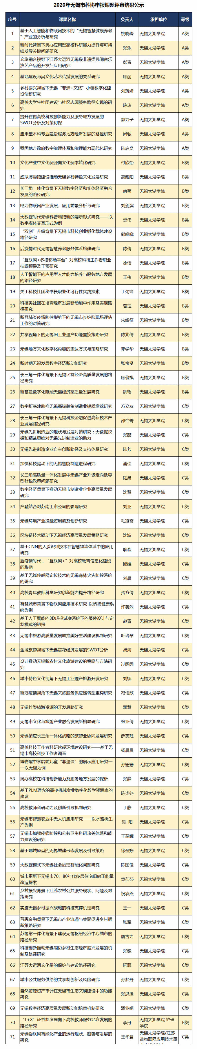 近日,无锡市科学技术协会发布了《2019-2020年无锡市科协软课题评审结果公示》,我校27项课题获“市科协2019年结题课题”,71项课题获“市科协2020年重点课题”立项,至此,我校在2020市社科与软科学课题立项数双双名列全市各单位之首。