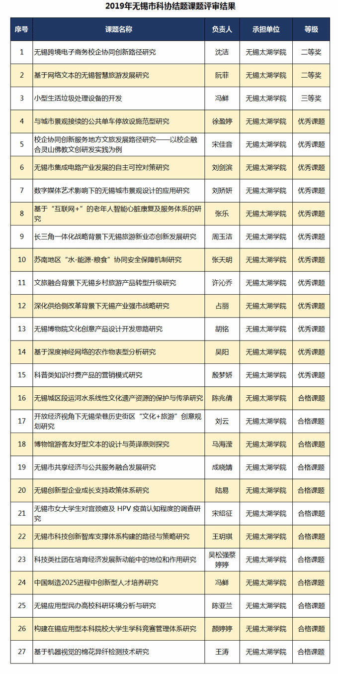 根据无锡市科协软课题评审结果公示,2019年无锡市科协共有152项结题课题,75个项目被评为优秀课题,我校沈洁《无锡跨境电子商务校企协同创新路径研究》、阮菲《基于网络文本的无锡智慧旅游发展研究》等15项课题获“市科协2019年结题课题” 优秀课题。2020年无锡市科协立项300个重点课题,其中资助课题100个,我校姚晓峰《基于人工智能和物联网技术的“无锡智慧健康养老”产业的分析与研究》、张乐《新时代背景下民办应用型高校科研能力提升与可持续发展关键问题研究》等27项课题获市科协资助课题立项。