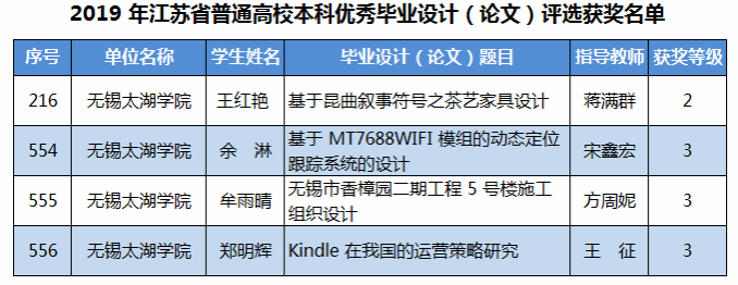 近日,江苏省教育评估院公布了2019年江苏省普通高校本科优秀毕业设计(论文)评选结果。我校在此项评选中,取得了历年最好成绩,共获得省级优秀毕业设计(论文)二等奖1项、三等奖3项。名单如下: