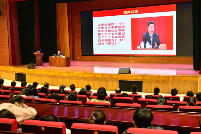 报告会上,许麟秋主席从党的十九届五中全会的会议背景、“十三五”期间成就、全会的重大意义、精髓要义,以及加强党的领导、凝聚实现“十四五”规划等方面进行详细解读。整个宣讲报告深入浅出,既有理论总结,也有材料剖析;既有形象说明,也有事实依据。为全体与会人员准确完整地学习领会和贯彻落实十九届五中全会精神提供重要帮助。