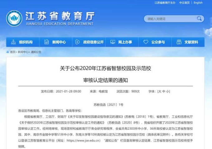 近日,省教育厅、省工业和信息化厅发布《关于公布2020年江苏省智慧校园及示范校审核认定结果的通知》,公布了2020年江苏省智慧校园审核认定结果,我校被认定为 “江苏省智慧校园”。