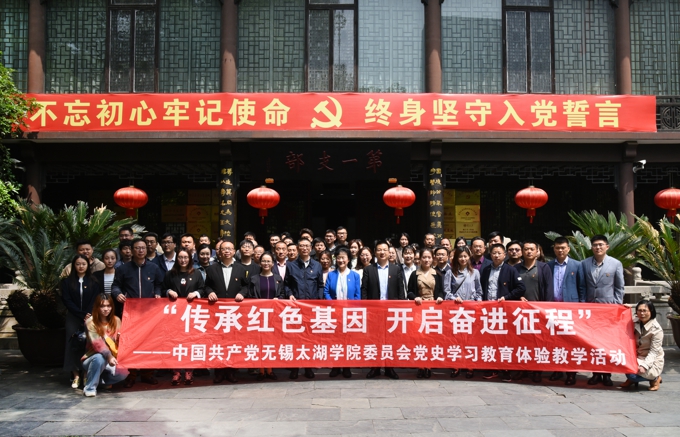 根据学校党史学习教育方案安排,为推动学校党史学习教育走深走实,引领全校党员干部认真做到学党史、悟思想、办实事、开新局,4月24日,学校党委组织党员赴无锡市第一支部党建基地,开展“传承红色基因 开启奋进征程”党史学习教育体验教学活动。学校理事长、党委书记金秋萍,党委副书记丁涛,校长助理阙明坤出席活动。党委委员吴学林、邹山花、周鸣鸣、吴旻昊, 全体中层干部,二级党总支书记、副书记以及部分师生党员代表近80人参加活动。