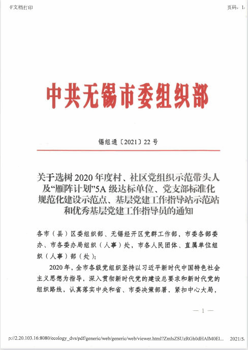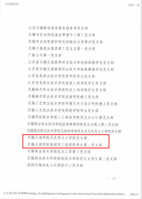 5月18日,中共无锡市委组织部发布了《关于选树2020年度村、社区党组织示范带头人及“雁阵计划”5A级达标单位、党支部标准化规范化建设示范点、基层党建工作指导站示范站和优秀基层党建工作指导员的通知》。其中,共有15个高校党支部获得无锡市“党支部标准化规范化建设示范点”称号,无锡太湖学院马克思主义学院党支部以及物联网工程学院学生第一党支部位列其中。