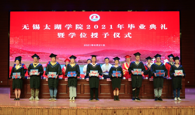 毕业典礼在庄严的国歌声中拉开帷幕。副校长陈鹏飞宣读《无锡太湖学院2021届本科毕业生毕业暨学士学位授予决议》。3597名学生达到学校毕业要求,校领导为毕业生代表颁发了毕业证书、学位证书。校领导阙明坤宣读了《关于表彰2021届优秀毕业生的决定》,97名同学获得“优秀毕业生”称号和荣誉证书。
