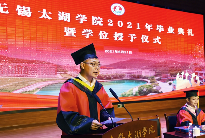 无锡太湖学院校长李廉水在讲话中首先恭喜同学们完成学业、顺利毕业!他说,4年前,你们从全国各地来到美丽的无锡太湖学院,你们在学习中孜孜不倦、勤于钻研,书写太湖学子的勤奋与务实;你们在全国科技竞赛中,挥洒汗水,勇夺第一,彰显太湖学子的才华与自信;你们在疫情防控和志愿服务中,传递爱心,回馈社会,播撒阳光,诠释了太湖学子的责任与担当。你们充分展示了太湖学子拼搏进取的精神风貌,诠释了“自强不息、经世致用”的校训精神,我们为你们感到骄傲!
