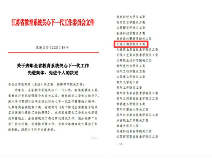 近日,江苏省教育系统关心下一代工作委员会印发了《关于表彰全省教育系统关心下一代工作先进集体、先进个人的决定》(苏教关委[2021]19号),我校关心下一代工作委员会荣获“江苏省教育系统关心下一代工作先进集体”称号。