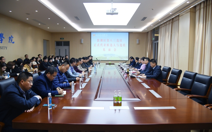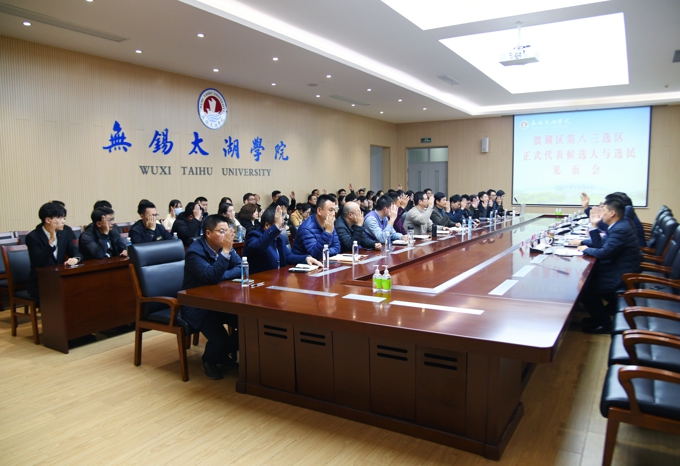 按照无锡市滨湖人大代表换届选举统一安排,为增进广大选民对区人大代表正式候选人的了解,保障民主选举权利,同时帮助代表正式候选人更好地了解选民意愿,履行代表职责,12月6日下午,我校在工科实验大楼一楼召开区人大代表正式候选人与选民代表见面会。学校理事长、党委书记金秋萍,校领导孙玉坤、丁涛出席见面会。区人大代表正式候选人及选民代表40余人参加见面会。