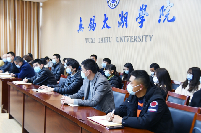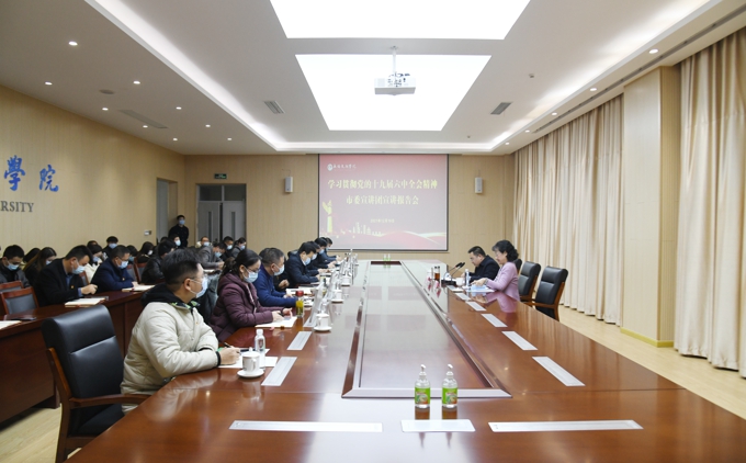 12月16日,无锡太湖学院举行学习贯彻党的十九届六中全会精神市委宣讲团宣讲报告会。市委宣讲团成员,滨湖区委常委、宣传部部长周俊鹏作专题宣讲。学校理事长、党委书记金秋萍,校领导孙玉坤,校党委委员,各党总支书记、副书记,党支部书记,师生党员代表参加报告会。
