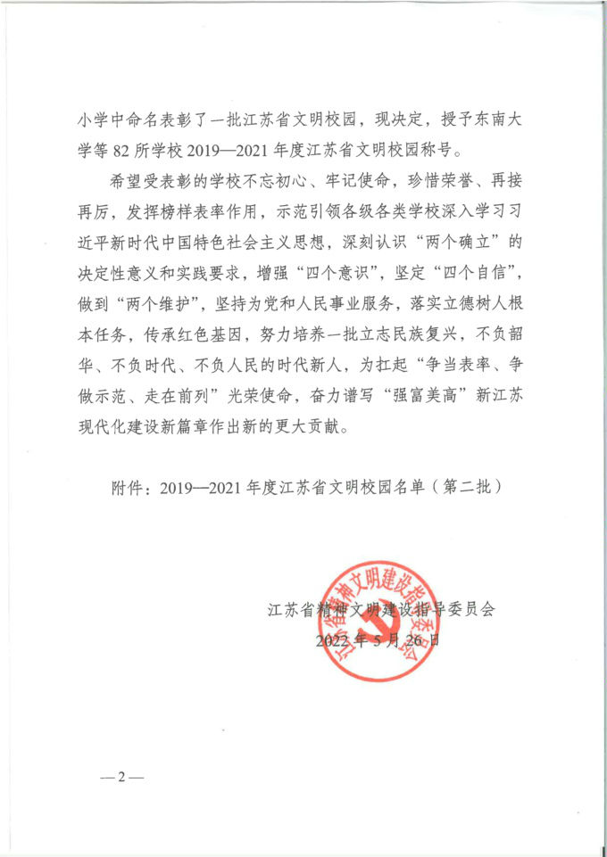 5月26日,江苏省精神文明建设指导委员会印发了《关于命名东南大学等学校2019—2021年度江苏省文明校园的决定》(苏文明委〔2022〕8号),我校再次荣获“江苏省文明校园”称号。
