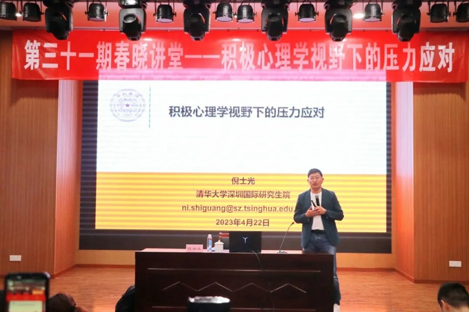 2023年4月21日9:00,无锡太湖学院第三十一期春晓讲堂于大学生活动中心A如期举行。本次讲堂有幸邀请到清华大学深圳国际研究生院的倪士光教授,并采用线上线下相结合的方式,开展以“积极心理学视野下的压力应对”为主题的心理健康讲座。讲座前,学校党委副书记丁涛接见了倪士光教授,丁书记代表学校对倪士光教授的到来表示欢迎,对倪教授为我校师生在心理健康教育工作等方面进行指导表示感谢。