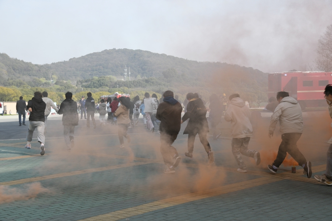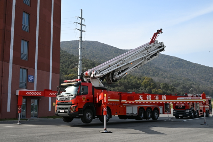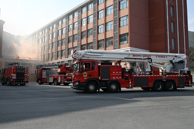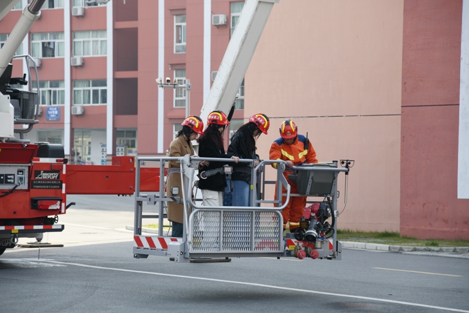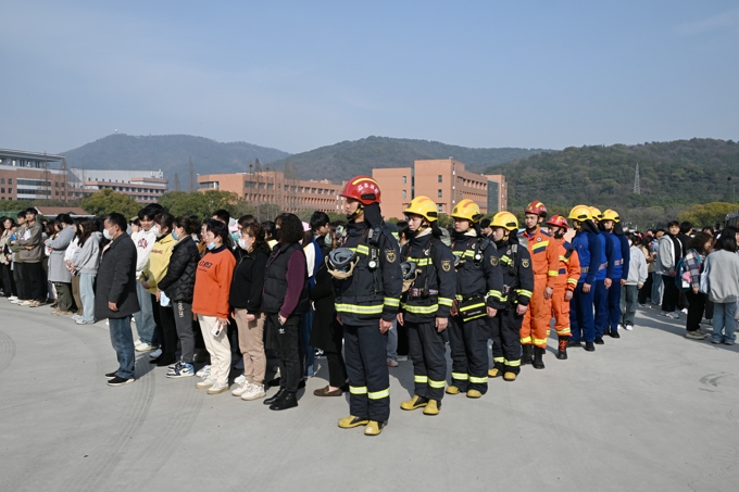 随着无锡市消防救援支队作战训练处冯剑秋处长宣布演练正式开始,学生宿舍内某处突然冒出大量浓烟,宿管员迅速查看确认火情后迅速摁下消防一键警报,启动应急广播,急促的警铃响起,同学们在辅导员及宿管员的带领下,按照“安全第一、就近逃生”的疏散原则,俯身、弯腰、用毛巾等捂住口鼻,贴着墙脚,保持着安全距离,沿着指定的路线快速疏散,仅用了2分14秒,1600余名学生就全部迅速有序地撤离到了安全区域。随后,消防救援人员利用无人机精准进行火情侦察、确定着火点位后,迅速果断的使用喷雾水炮消防车、登高平台消防车、云梯消防车等多类专业设施向同学们全面展示了火情压制、精准扑灭、高空救援等精彩场景。最后,当一辆消防车缓缓举臂,将登高平台升至学生宿舍6楼把“被困”的三名学生成功救出时,演练现场爆发出雷鸣般的掌声,为全体消防指战员们饱满的工作热情、高超的灭火技能和专业的救助手段齐声喝彩。