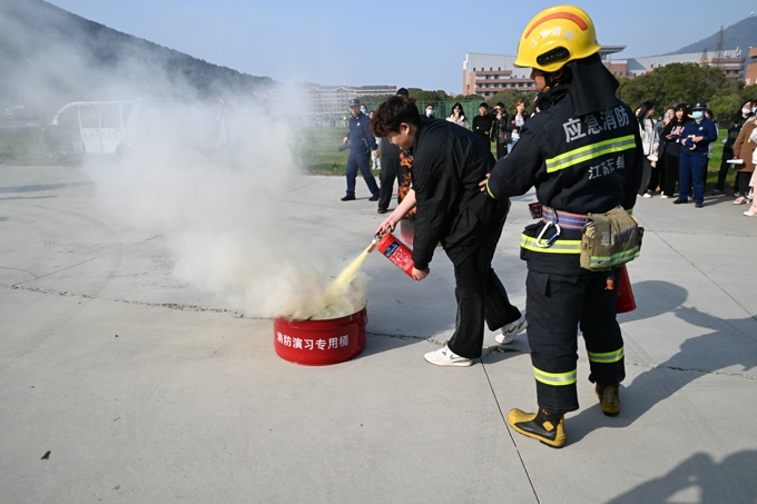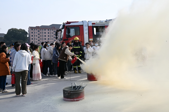 演练结束后,无锡市消防救援支队围绕火灾预防、消防安全、应急逃生等三个方面开展了消防安全培训。现场进行消防知识有奖问答,消防员详细介绍并示范灭火器、消火栓等常见消防设施器材的使用方法及操作要领,并指导同学们进行油盆灭火演练。同学们踊跃报名,按照讲解要求,逐一判断风向、选择站位、使用灭火器进行扑灭工作。