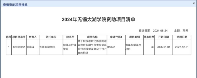 8月23日,国家自然科学基金委发布《关于2024年国家自然科学基金集中接收申请项目评审结果的通告》,我校健康与护理学院刘谆谆博士“基于积极老龄化体验的老年癌症长期生存者抑郁风险预测模型及复杂干预方案的构建”获得国家自然科学基金青年基金项目立项,项目批准号:82404052。本次获批是继2023年学校首次获得国家自然科学基金项目后的再次立项,标志着无锡太湖学院在自然科学领域不断取得新的重大突破。