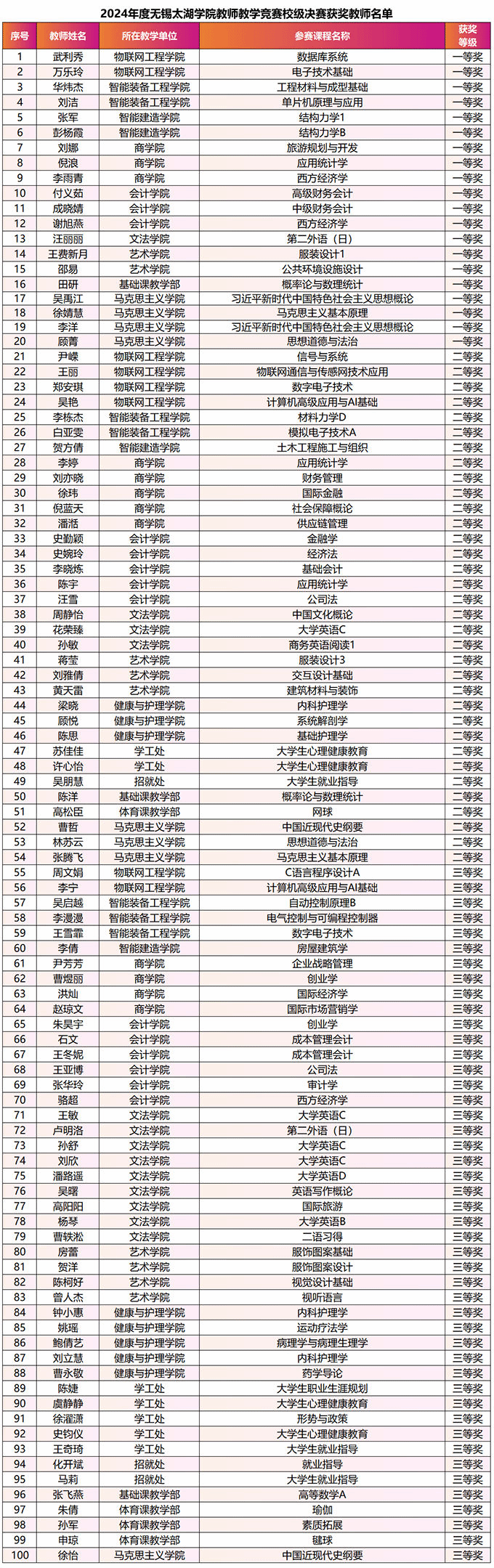 9月21日,无锡太湖学院2024年度教师教学竞赛决赛在商科大楼举行。经校内外专家现场评分,评选出一等奖20名、二等奖34名、三等奖46名。校领导吴健荣、陈鹏飞、阙明坤出席活动并担任评委,同时邀请了江南大学等高校有关专家担任校外专家评委。