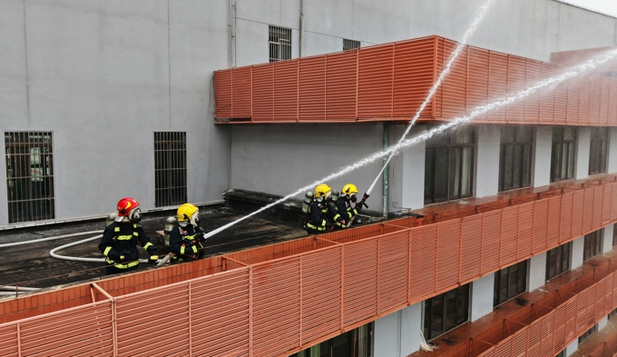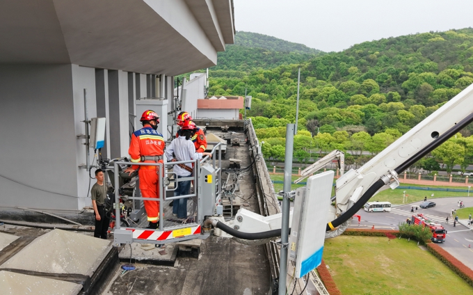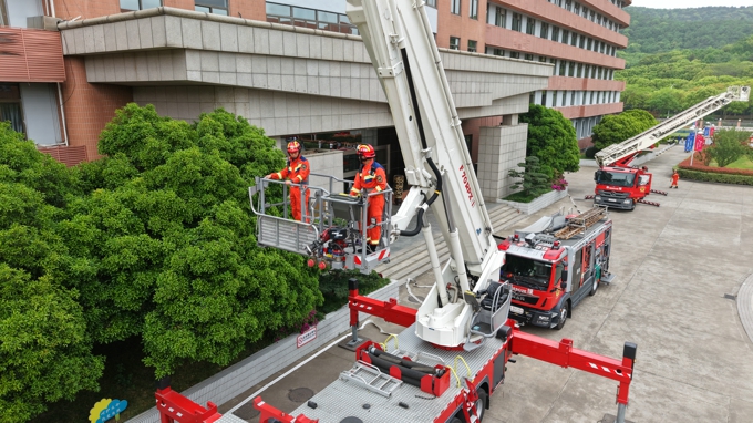 当日下午,随着无锡市消防救援支队作战训练处处长冯剑秋宣布演练正式开始,学校六号教学楼内模拟发生火灾事故。确认火情后,保卫处人员迅速摁下消防一键警报,启动应急广播。在急促的警铃声中,师生在工作人员带领下,按照“安全第一、就近逃生”的疏散原则,俯身、弯腰、用毛巾等捂住口鼻,贴着墙脚,保持着安全距离,沿着指定的路线快速疏散,仅用了1分57秒,近千名师生全部迅速有序撤离至指定区域。随后,消防救援人员利用无人机精准侦察火情、确定着火点位,并迅速果断使用压缩泡沫消防车、登高平台消防车等设备解救被困人员,同时,消防人员利用多节臂高喷车、消防指挥车、无人消防坦克等多类专业设施向同学们全面展示了火情压制、精准扑灭、高空救援等场景。当消防车缓缓举臂,将登高平台升至7楼救出“被困”的2名同学时,现场爆发出雷鸣般掌声,为全体消防指战员们饱满的工作热情、高超的灭火技能和专业的救助手段齐声喝彩。