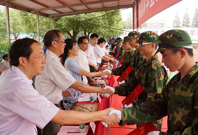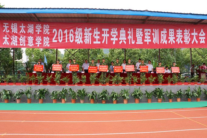 学校党委副书记丁涛宣读《关于表彰2016级新生军训先进集体和先进个人的决定》,对二连、三连、七连、十连,十三连、十五连、十八连、十九连、二十连、二十一连等10个军训先进集体,浦一伟等119名军训优秀标兵予以颁奖表彰。大会还表彰了2016级优秀新生,对超过江苏省本一分数线的钱立涛等一批优秀新生给予每人10000元优秀新生奖学金,对超过江苏省本二分数线的朱慧等一批优秀新生给予每人3000元优秀新生奖学金。喜获万元奖学金的审计1603班陈志敏同学代表全体新生发言,衷心感谢为军训付出辛苦劳动的部队教官们,衷心感谢学校的精心部署和周到安排,以军训这一特殊形式的大课堂,为同学们开启了大学生涯的崭新一页;表示将勇于拼搏,发奋学习,争做太湖学院的优秀学子。