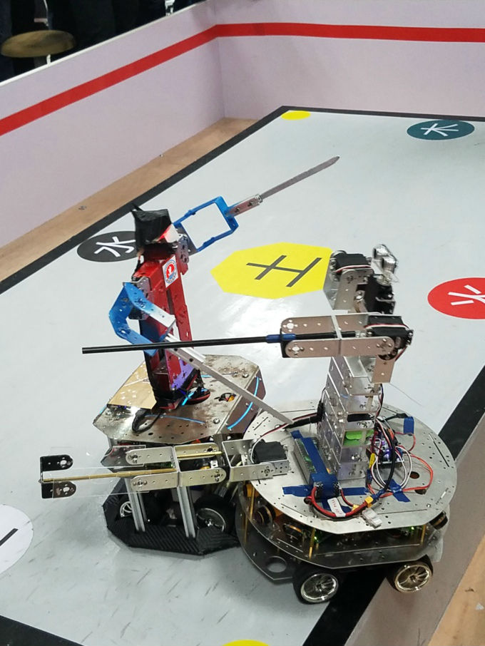 “进攻啦!”“打起来了!”在武术机器人赛场围观的人群中,不时有人点评分析战况。代表我校出阵的机器人选手,有“血滴子”、“姜子牙”、“雷阵子”、“绝代双骄”和“天山童姥”等5位战将,无论在综合单人对打,还是综合双人对打中都有不俗表现。“血滴子”单挑战南大金陵学院“铠甲勇士”时,连连使出“稳准狠”的招术,把对手拱翻倒地,使之坠落赛场外,轻松取得第一回合、第二回合的胜利。第三回合的哨声一吹响,“血滴子”稳步前行,虽有两次走到场边险些摔倒,让人替它捏了一把汗,可这个灵动的武士会自行纠偏,不断调整方向,直逼对方阵地。但“血滴子”怎么也想不到,“铠甲勇士”被摔了两跤后已经失灵,始终站在原地一动不动、一声不吭,结果“血滴子”与对手擦肩而过,自己一头栽倒在地,让围观者忍俊不禁。“血滴子”尽管输了这一局,仍以2:1取胜。在综合双打对决中,“绝代双骄”、“天山童姥”不畏强敌,在每一场搏击中,充分发挥个人特长,凝练团队力量,最终取得3:0的好成绩,一战成名。