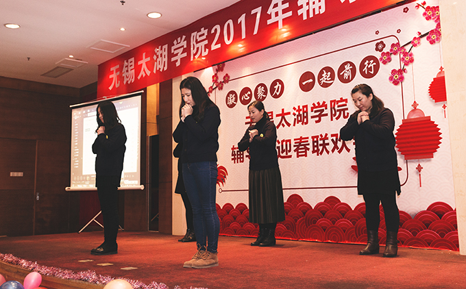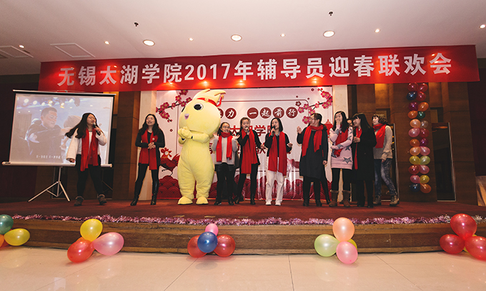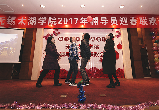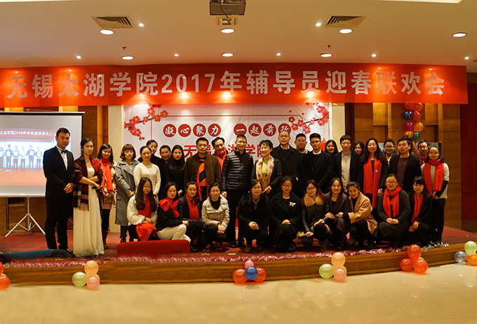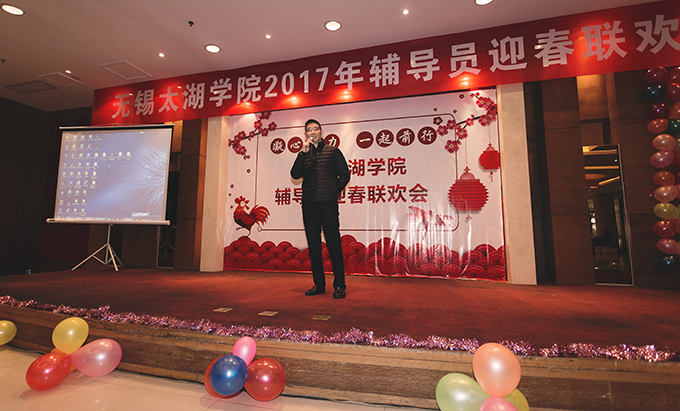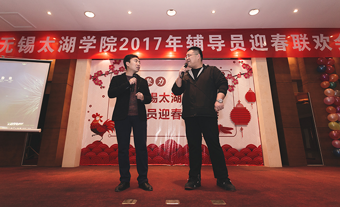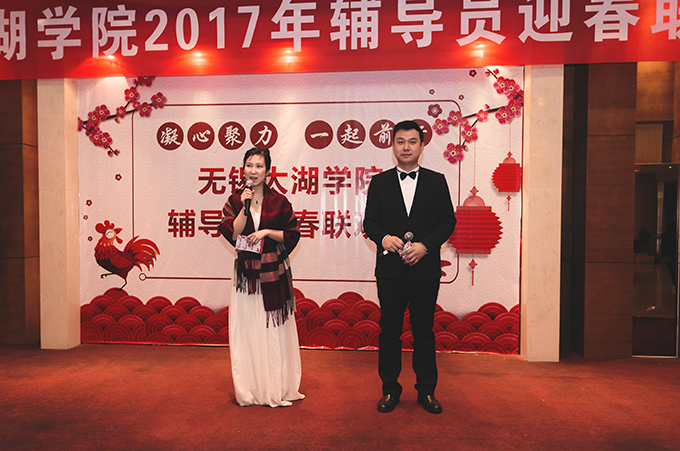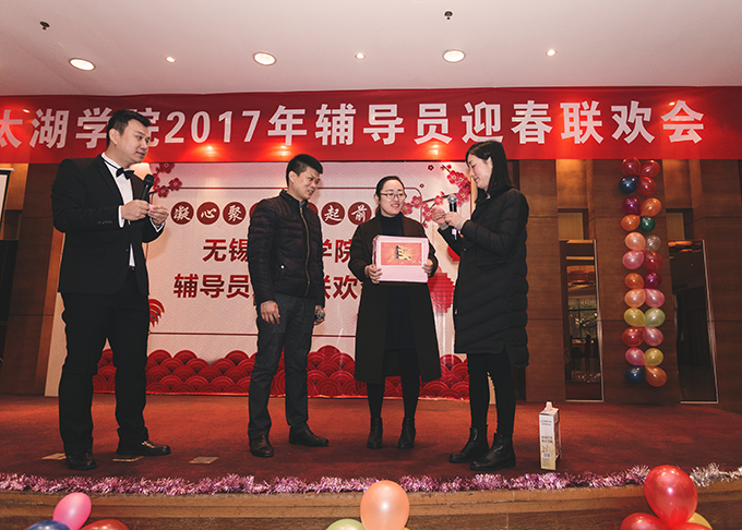 本网讯 1月8日上午,我校2017年辅导员迎春联欢会在太湖花卉园隆重举行。校领导金秋萍、丁涛、陈鹏飞与110多名辅导员欢聚一堂,校办、学工处、招就处、校团委相关成员,各学院负责学生工作的党总支副书记、学工秘书参加联欢会。本次联欢会由校学生工作处主办,物联网工程学院和土木工程学院承办,外国语学院俞昊波和会计学院王新星主持。