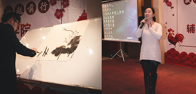 整个联欢会精彩纷呈、高潮迭起,表演形式丰富,内容新颖。商学院合唱的《日不落》、物联网工程学院和机电工程学院联袂出演的相声《做个有钱人》、艺术学院的歌曲合唱《党员修炼手册》、土木工程学院和护理学院携手带来的手语表演《感恩的心》、会计学院和外国语学院合作的歌曲水墨画结合表演《祖国颂》等节目为在场观众带来一场视听盛宴,穿插其中的抽奖环节和“包饺子比赛”等互动游戏将迎春联欢会的气氛推向高潮。