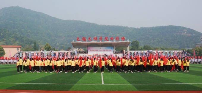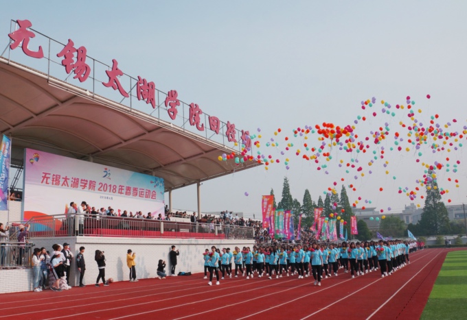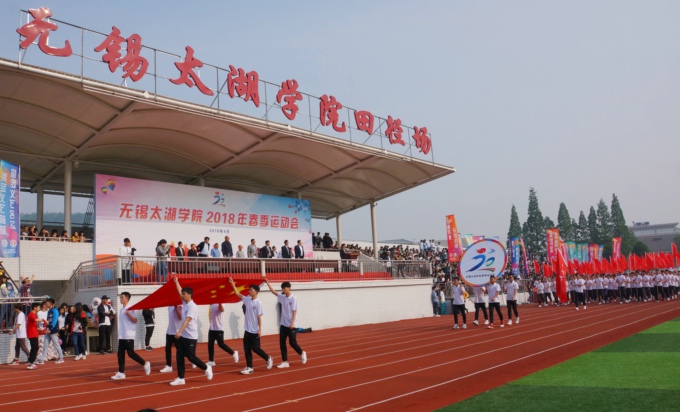 伴随着时代的鼓点,鲜艳的五星红旗走进了田径场。紧跟国旗的是无锡太湖学院2018年春季运动会的会徽。春风拂面,桃李芬芳。各学院方阵踩着青春的步伐,伴着高亢的运动员进行曲,身着统一服装、迈着矫健整齐的步伐,依次入场,接受检阅。他们英姿飒爽,意气风发,展示出全校师生朝气蓬勃、昂扬向上的精神风貌。