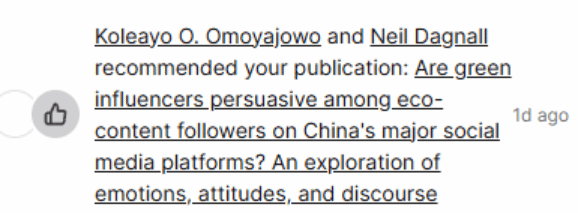论文发表后,迅速获国际学界关注。英国曼彻斯特城市大学应用认知心理学教授Neil Dagnall博士在国际学术社交平台ResearchGate上对该文予以点赞推荐。Dagnall教授在心理学领域著述颇丰,引用量逾六千次,其认可标志着该研究成果已成功进入国际同行视野。